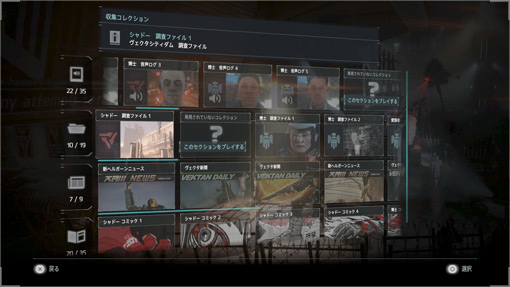 キャンペーンのミッション中に「音声ログ」、「調査ファイル」、「新聞」、「コミック」の4種類の収集物を拾うことができます。獲得した収集物は収集コレクションのメニューで確認できます。プレイ中、収集物を獲得したときにOPTIONSボタンを押すと、その場で拾った収集物の内容を確認できます。