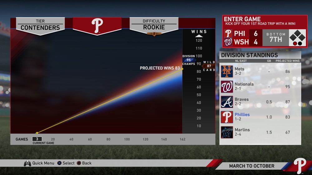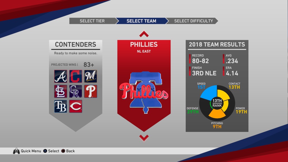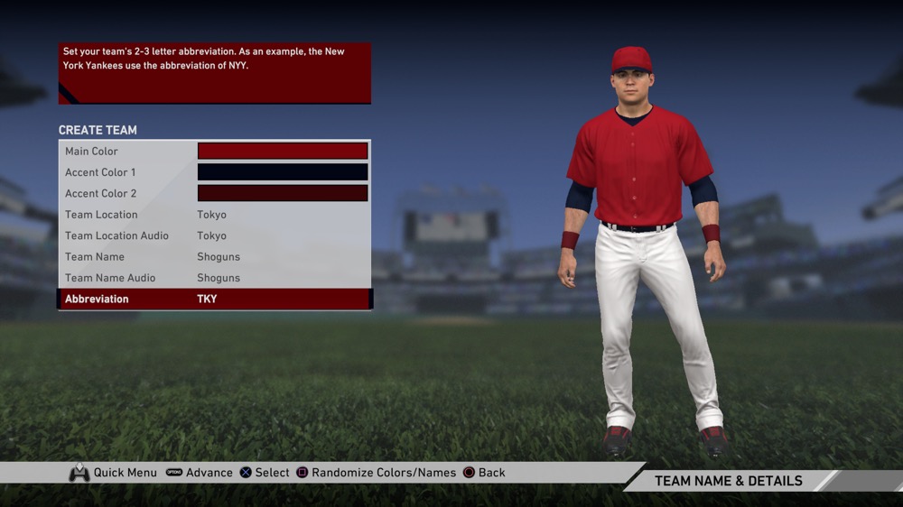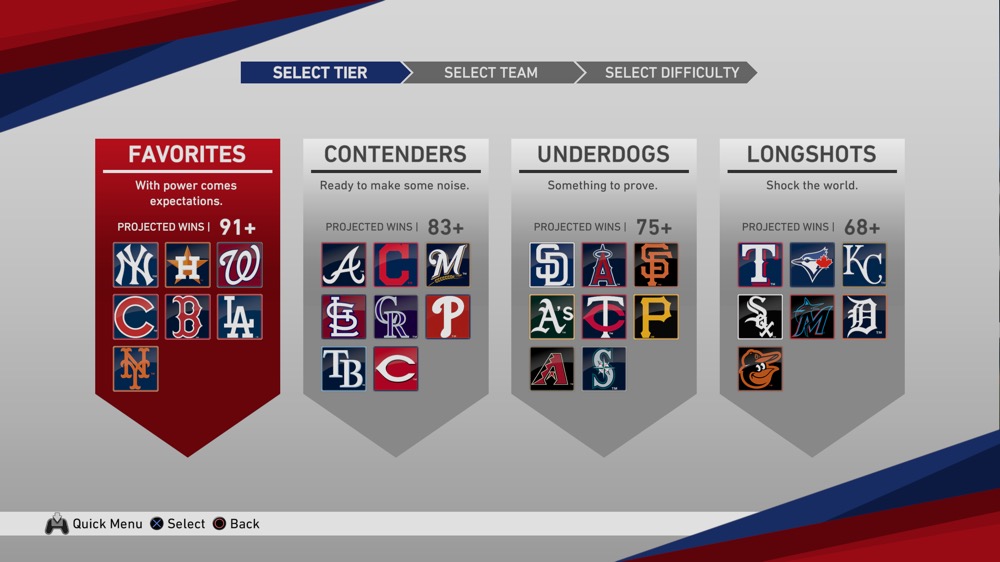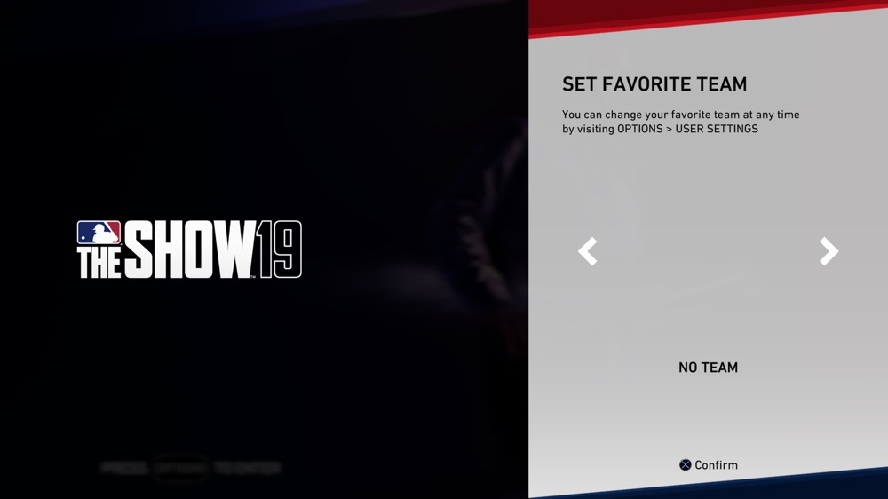 ※一度決定した後でも、【OPTIONS(設定)】の【USER SETTINGS(ユーザー設定)】にある【SET FAVORITE TEAM(お気に入りチーム設定)】で変更できます